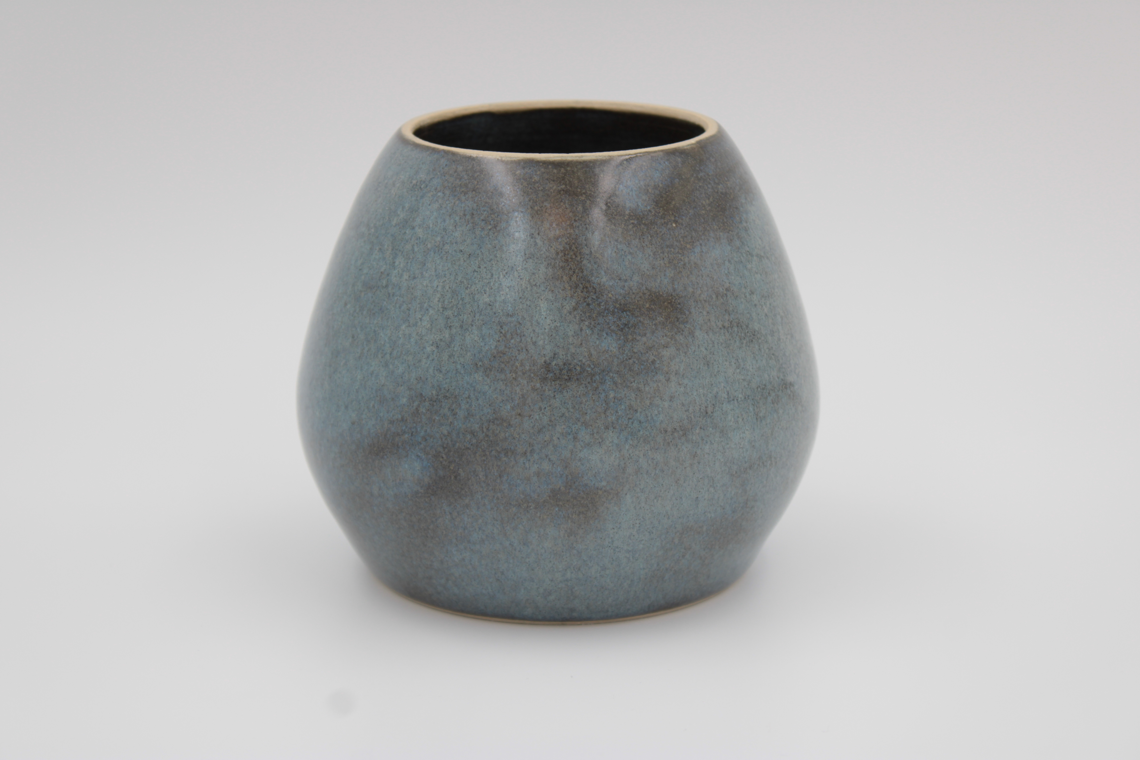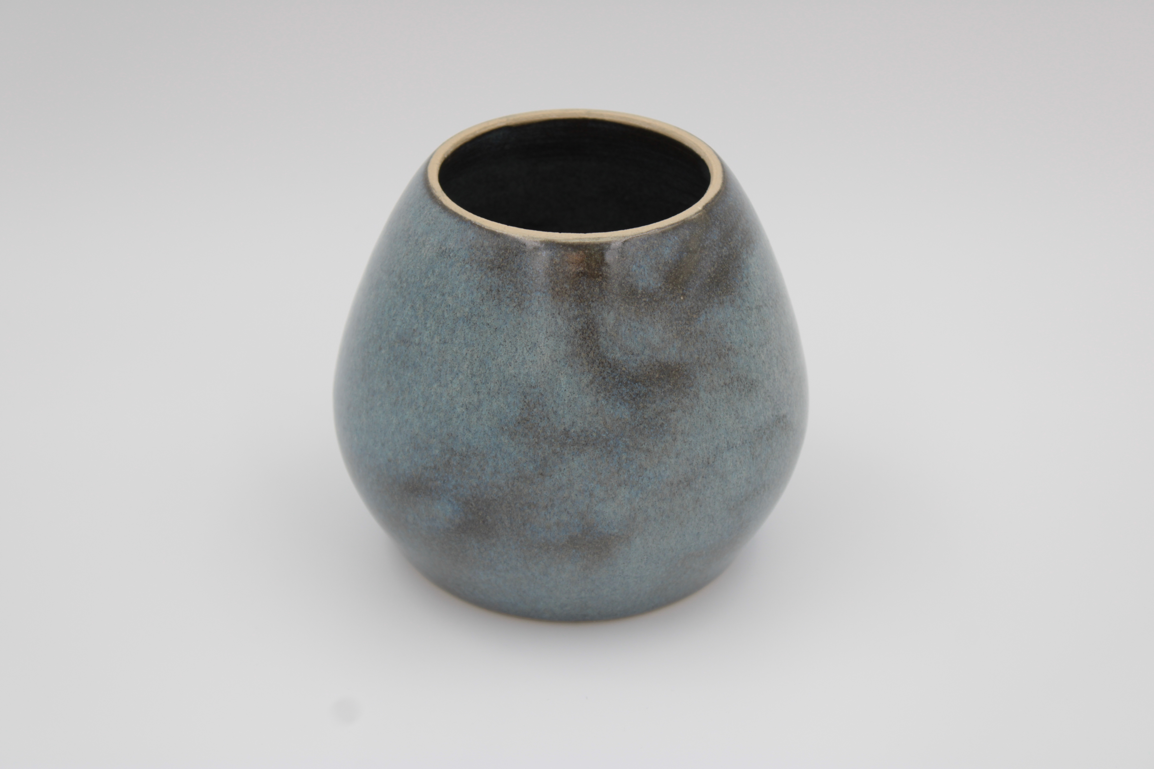 Vase med blåmeleret glasur på lys ler. Kanten står rå.