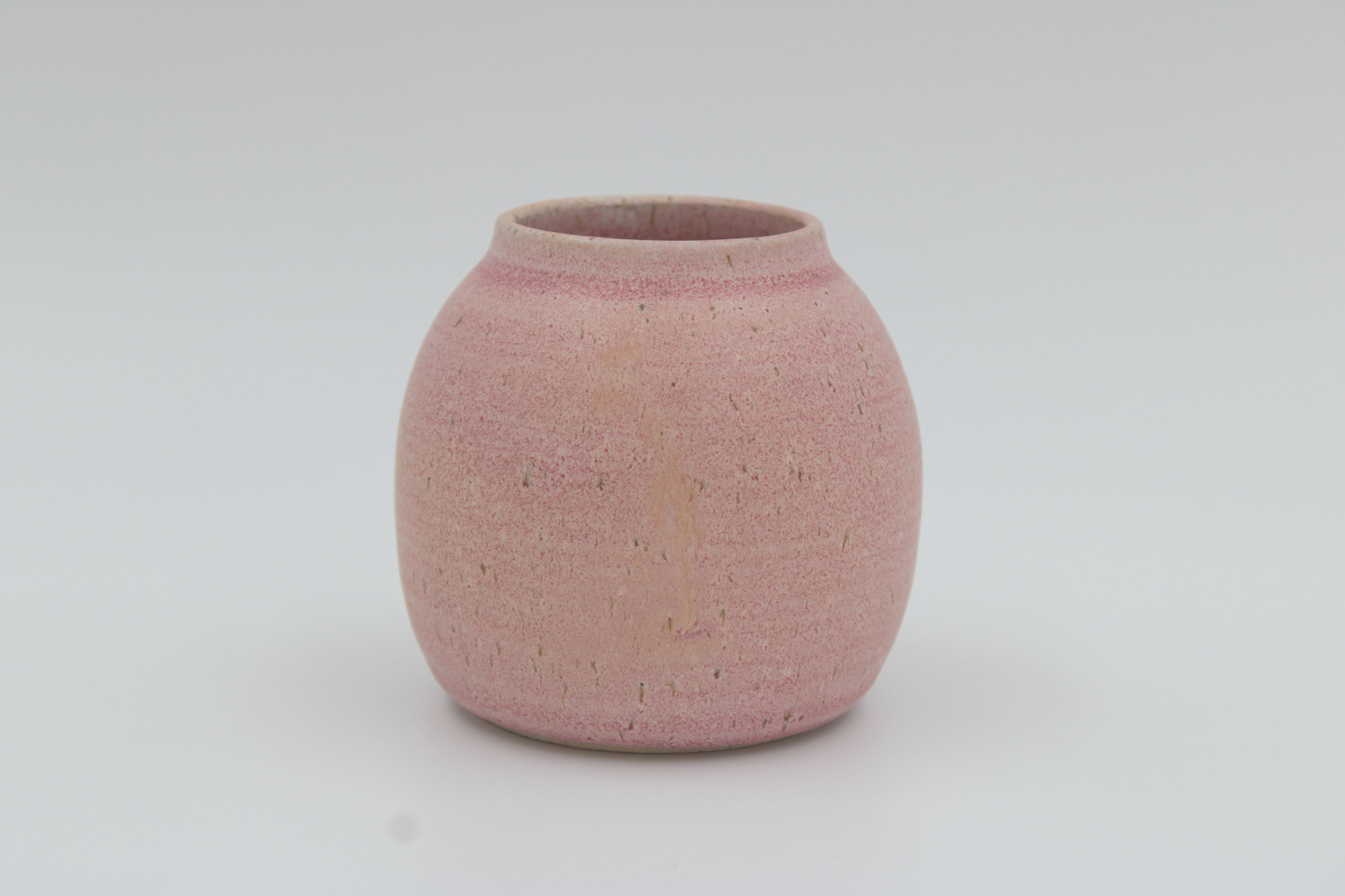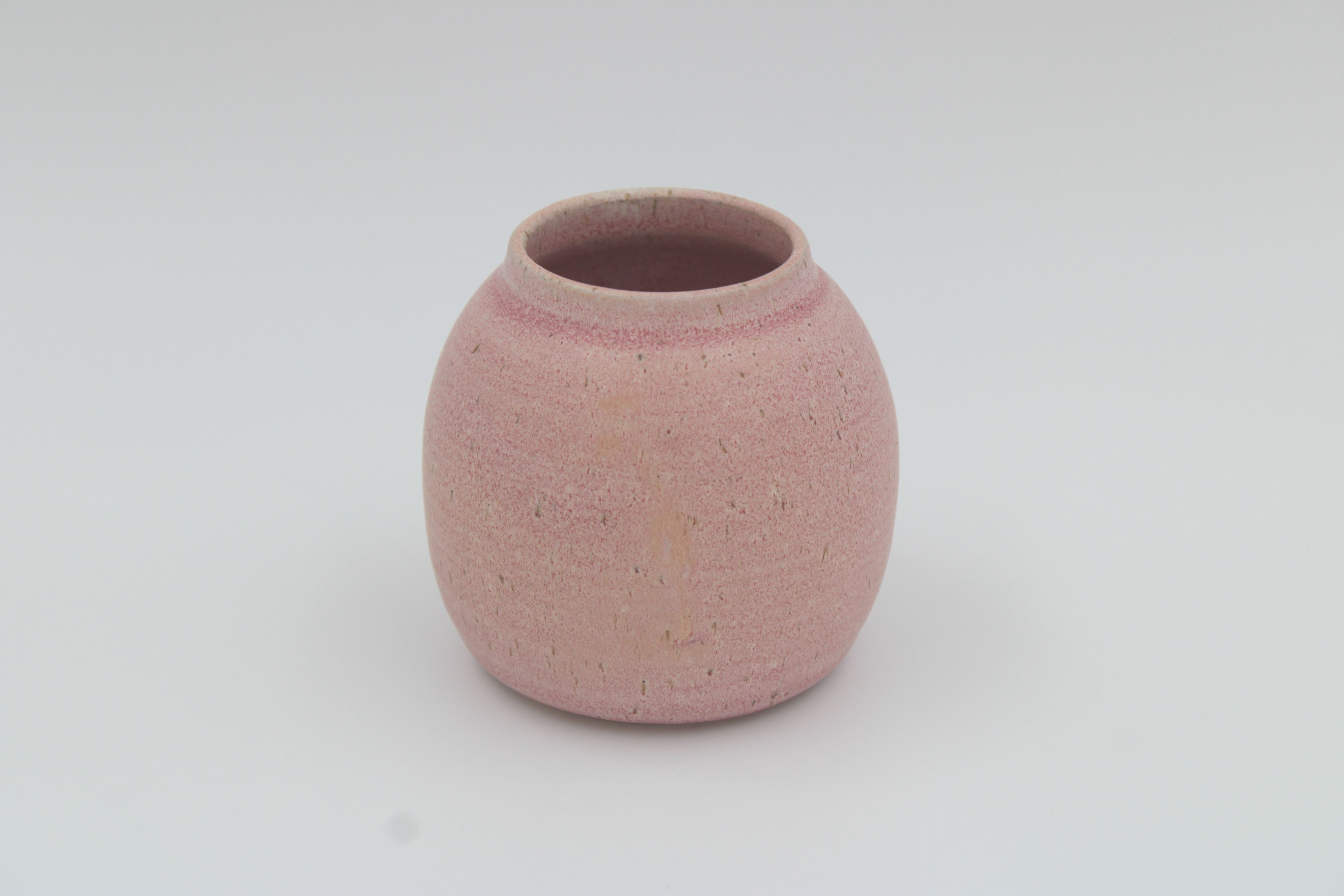 Lille vase med lyserød mat glasur på ler med pyritter.