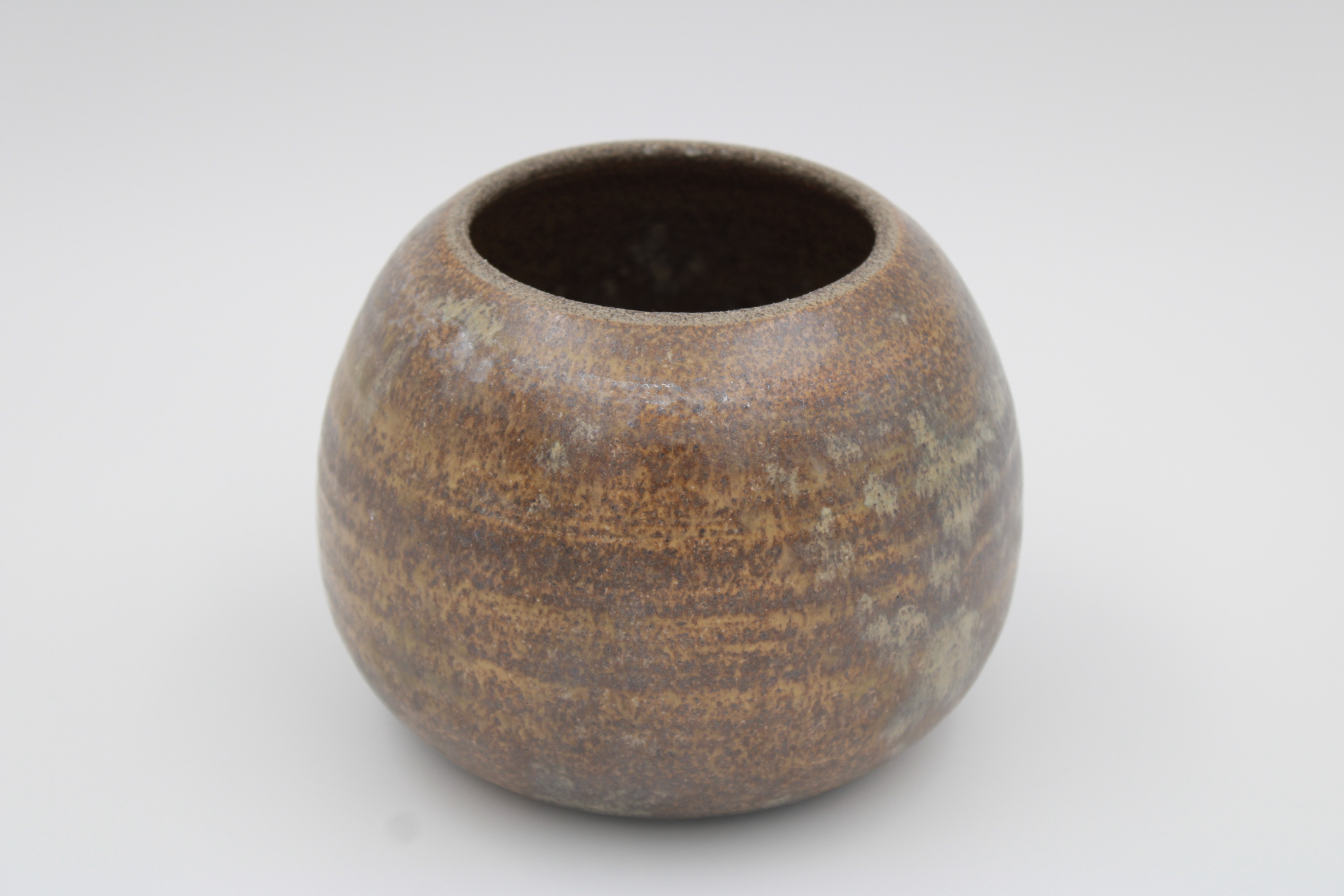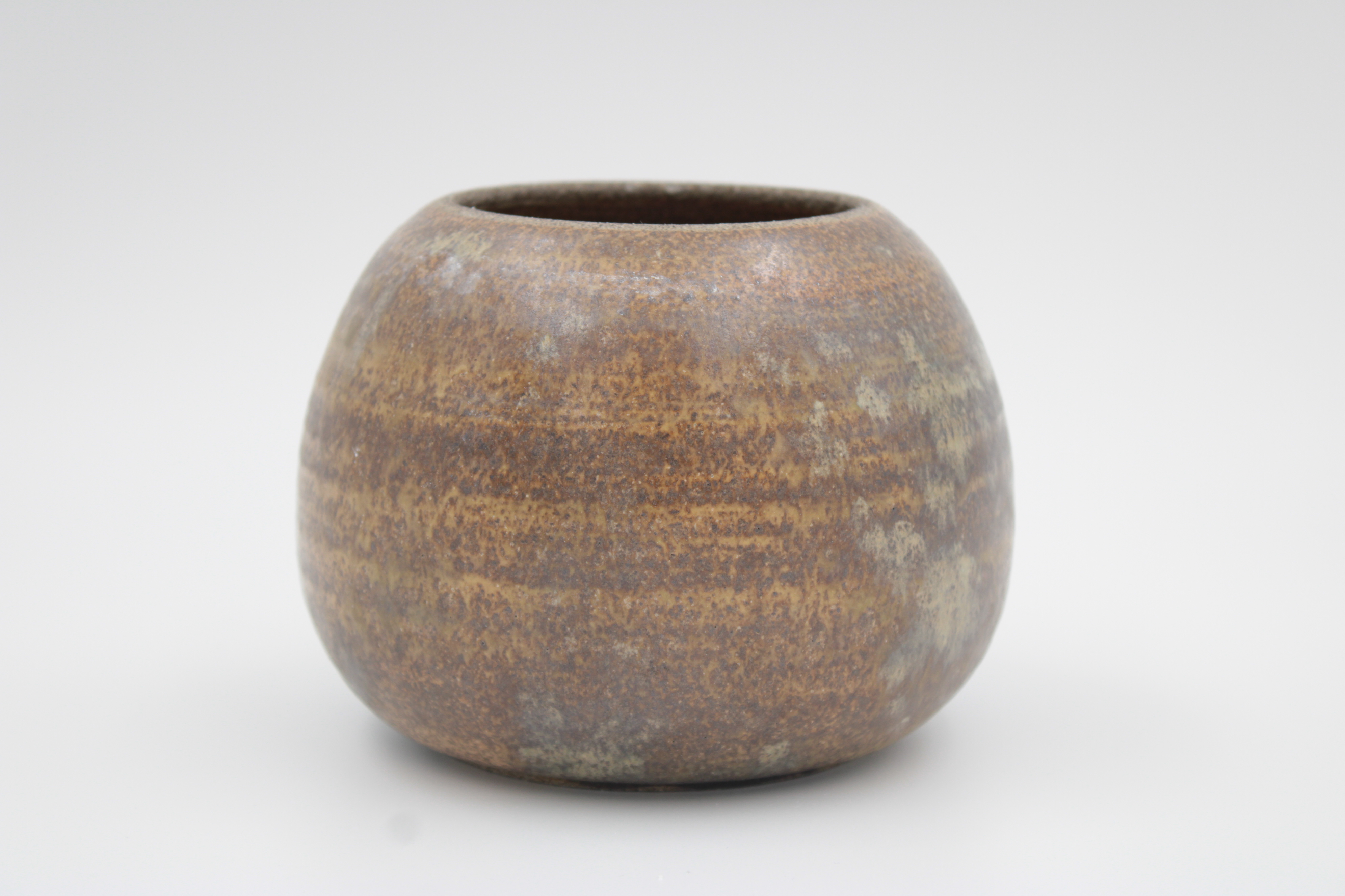 Skål / krukke i mat brunlig nuance på en grå ler. Kanten står rå.